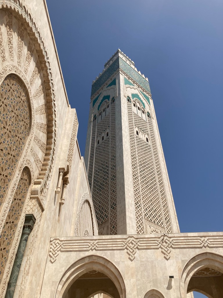 Sie ist eine der größten Moscheen der Welt. Sie ist nach dem seit 1961 regierenden und im Jahr 1999 verstorbenen König Hassan II benannt; sie wurde vom in Marokko lebenden französischen Architekten Michel Pinseau entworfen. Ihr Minarett ist mit ca. 200 m Höhe das zweithöchste Minarett der Welt. Sie ist sowohl innen als auch außen so beeindruckend, dass man das auf Fotos gar nicht festhalten kann. Hier nur ein paar Eindrücke.
