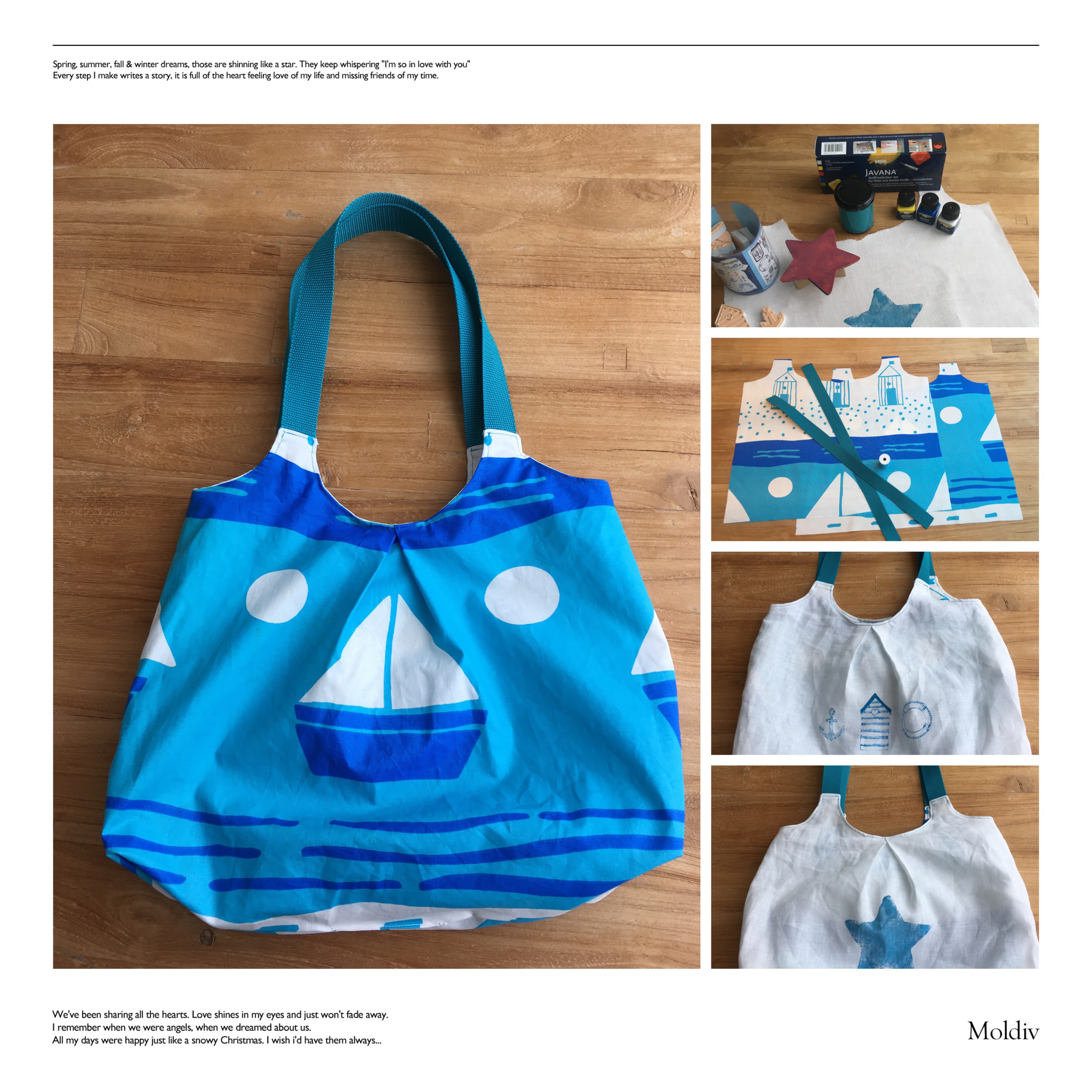Ein altes Wachstuch Tischtuch und ein Leinenstoffrest mussten zu einer Strandtasche verarbeitet werden. Also hab ich mir zuerst Stempel besorgt und da es keinen Sternstempel gab, habe ich einen aus Moosgummi gebastelt, die Farbe gemischt und losgestempelt. Die Tasche habe ich nach folgendem Schnitt genäht: http://pin.it/bmhOARl