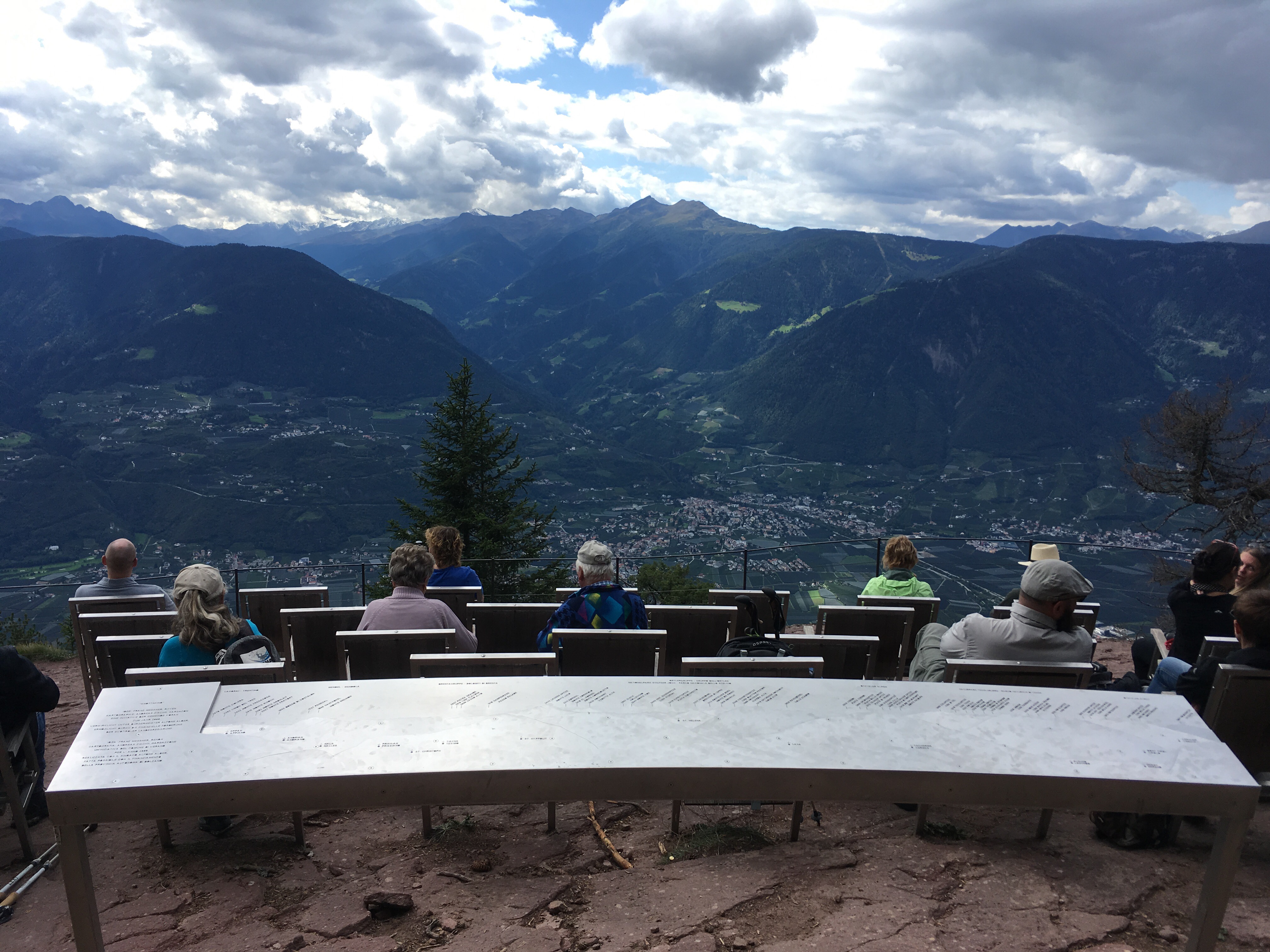 Heute waren wir im schönsten Freiluftkino, dem Knottnkino. Ein Aussichtspunkt auf dem Porphyrfelsen Rotsteinkogel in 1465 m Höhe bei Vöran. „Knottn“ bedeutet im Südtiroler Dialekt „Fels“.